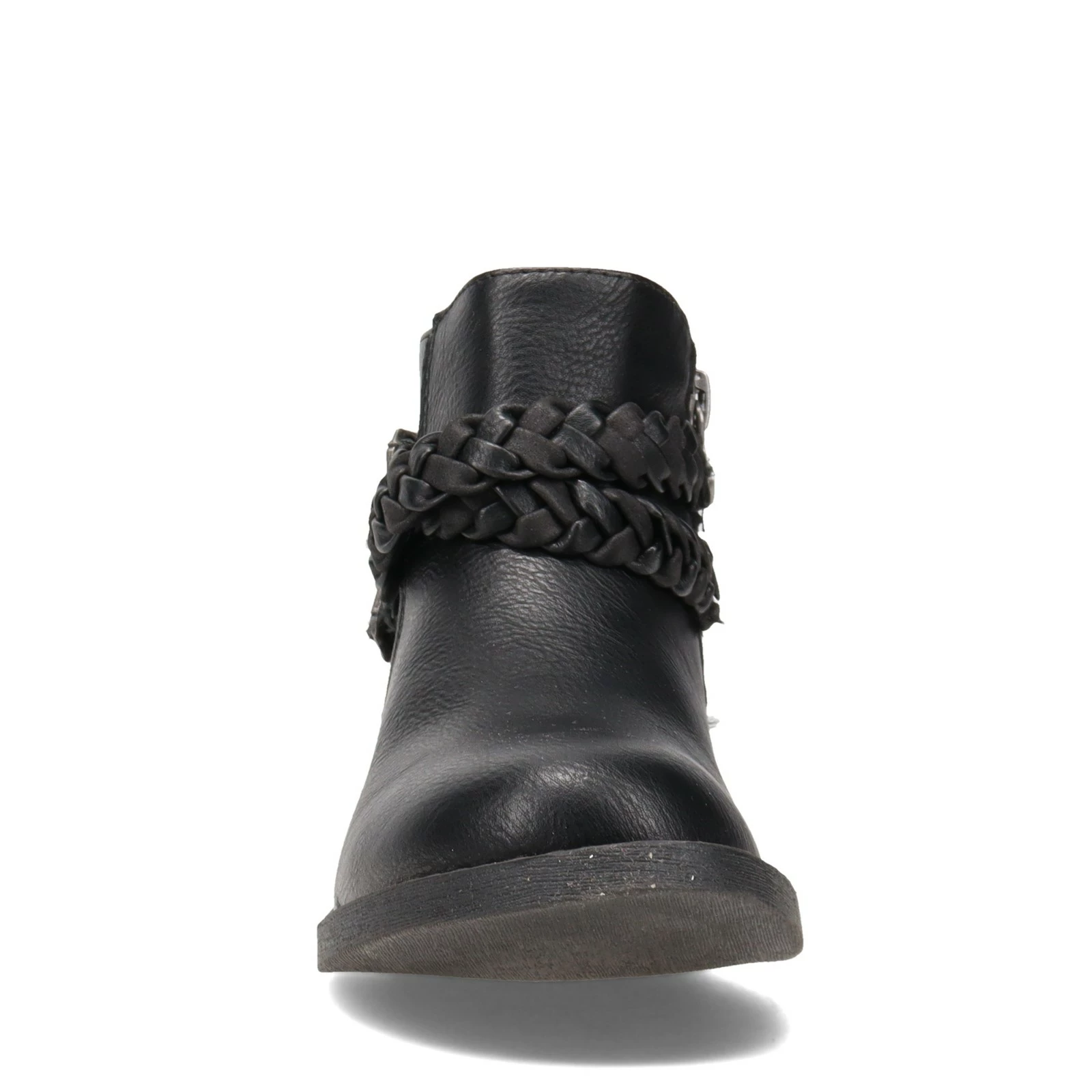 - Faux leather upper with strap accents