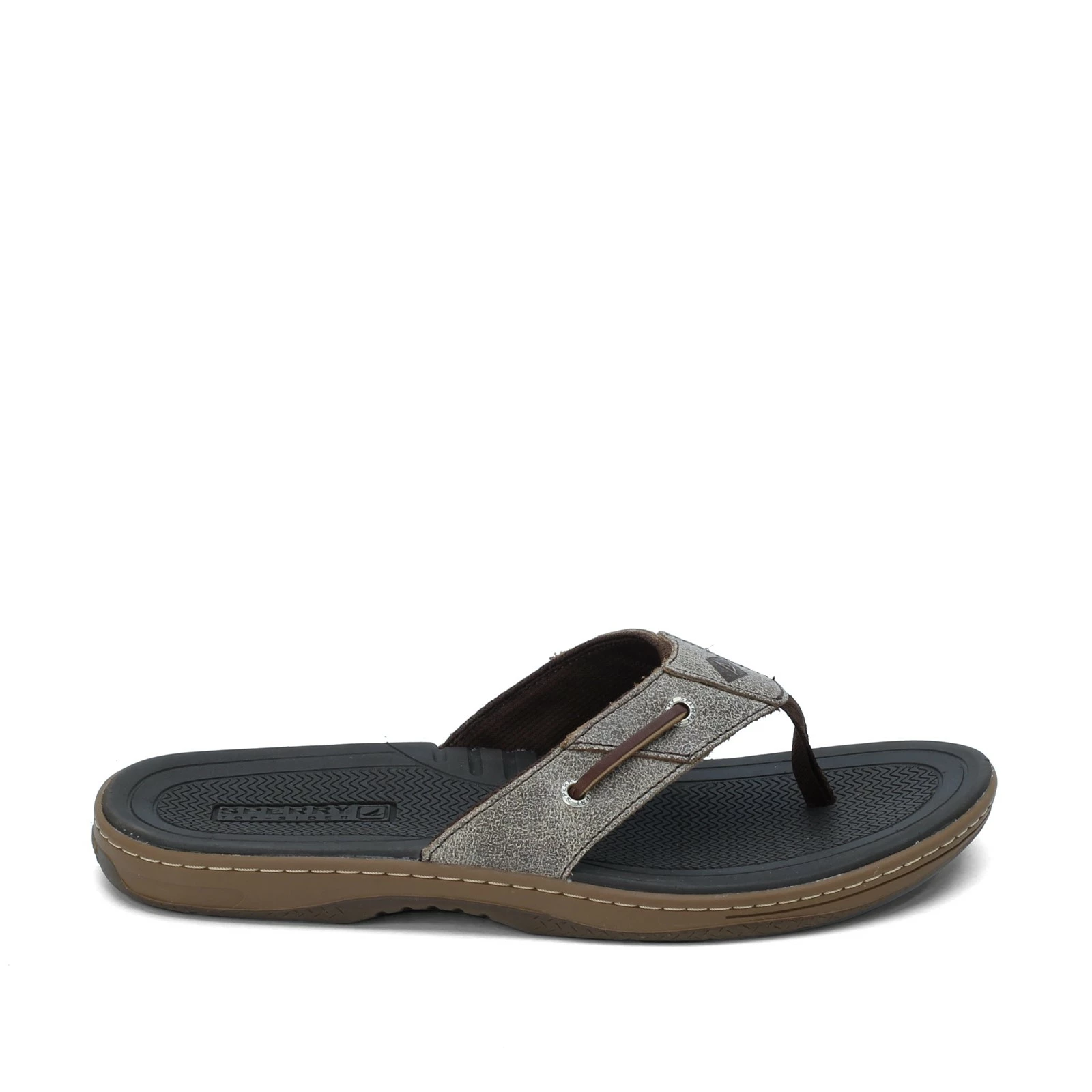 Men’s Sperry, Baitfish Sandal. Slip these nautical inspired flip flops on and lounge the day away at the beach. This laid back sandal offers excellent traction on wet or dry surfaces with a molded rubber bottom featuring adaptive Wave-Siping traction pattern.