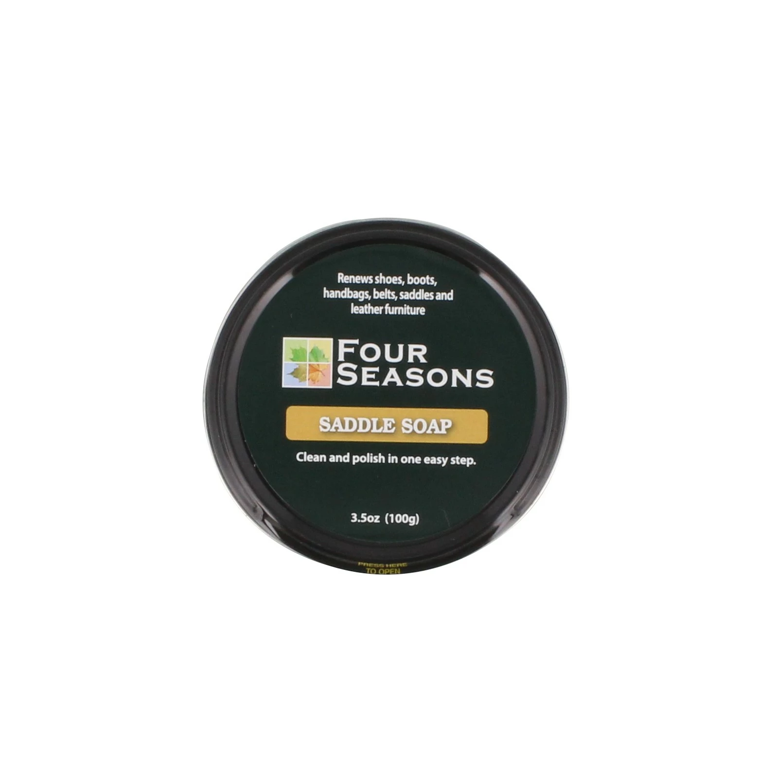 Four Seasons, SADDLE SOAP 3.5 OZ polish. Use to clean and polish leather products in one easy step.